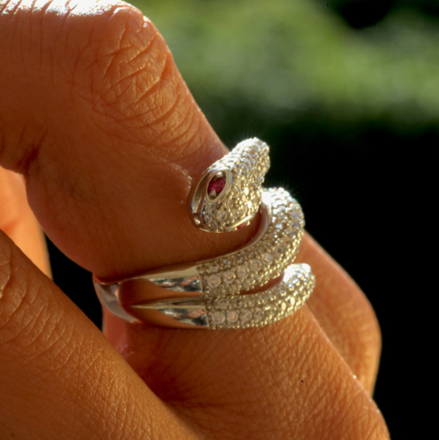 Cette bague envoûtante est sculptée en forme de serpent, dont le corps sinueux s’enroule avec grâce autour du doigt.